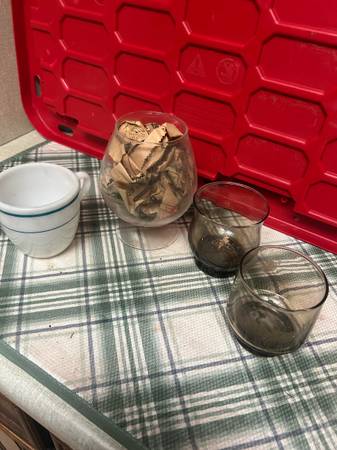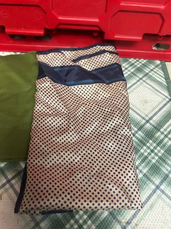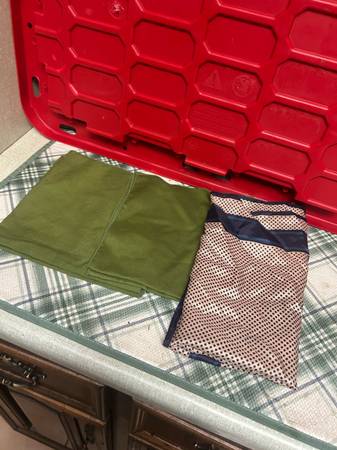 Two fabric pieces, one green and one with a dotted pattern. Located near bitters and 281.