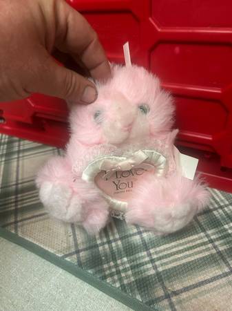 Soft pink plush bear holding a heart with 'I Love You' message. Located near bitters and 281.