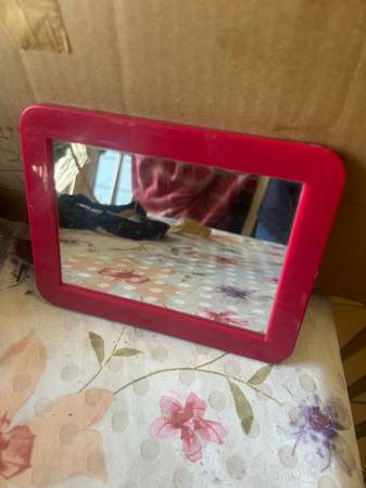 Small red framed mirror, perfect for tabletop use. Located near bitters and 281